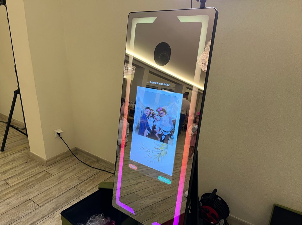 O mirror booth é uma forma elegante e interativa de tirar fotos, combinando diversão e sofisticação para criar lembranças personalizadas em qualquer evento.